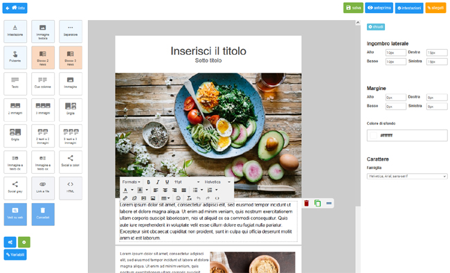 Una volta inserito il blocco potrai, cliccandoci sopra, editarlo e formattarlo come meglio credi, utilizzando la finestra coi comandi di editing che si aprirà in corrispondenza del testo stesso.