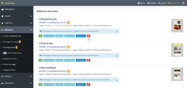 Puoi visualizzare un'anteprima dei messaggi che si trovano nella lista dei messaggi non spediti, degli spediti e delle spedizioni in corso. Troverai un'icona a forma di lente in corrispondenza di ogni messaggio incluso in queste liste: cliccaci per aprire l'anteprima.
