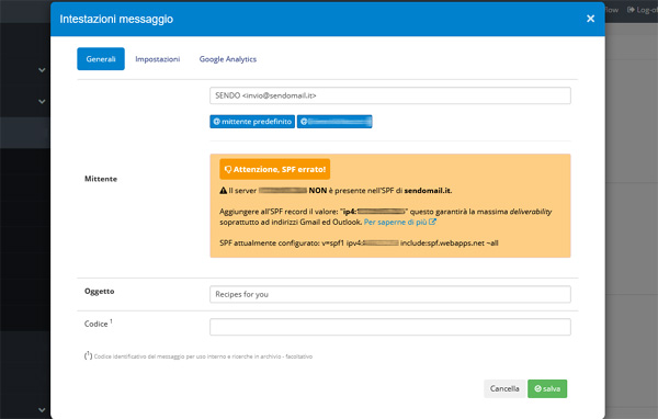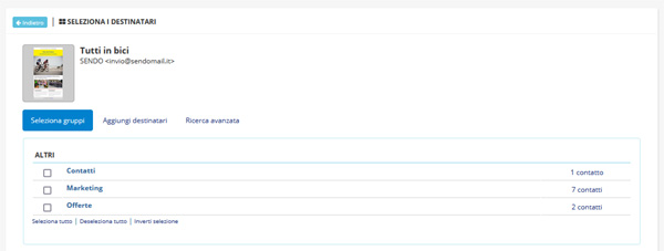 Cliccando su Spedisci accederai alla maschera di spedizione, dalla quale potrai selezionare i gruppi di destinatari e tutti gli altri parametri di spedizione. Puoi spedire immediatamente o programmare la spedizione per un momento successivo.