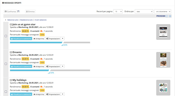Tutti i messaggi inviati per i quali esistono statistiche compaiono alla voce Lista messaggi del menù Statistiche. Nella lista sono indicate per ciascun messaggio alcune statistiche di base: