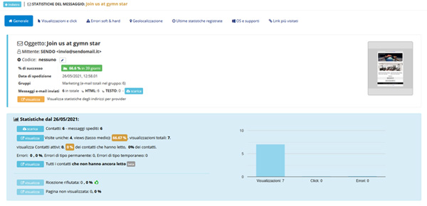 Viene mostrato anche il numero di contatti che ha interagito con i contenuti della newsletter, cliccando su un link presente nel messaggio. Questo dato è espresso anche in percentuale come tasso di contatti attivi sul totale delle visualizzazioni.